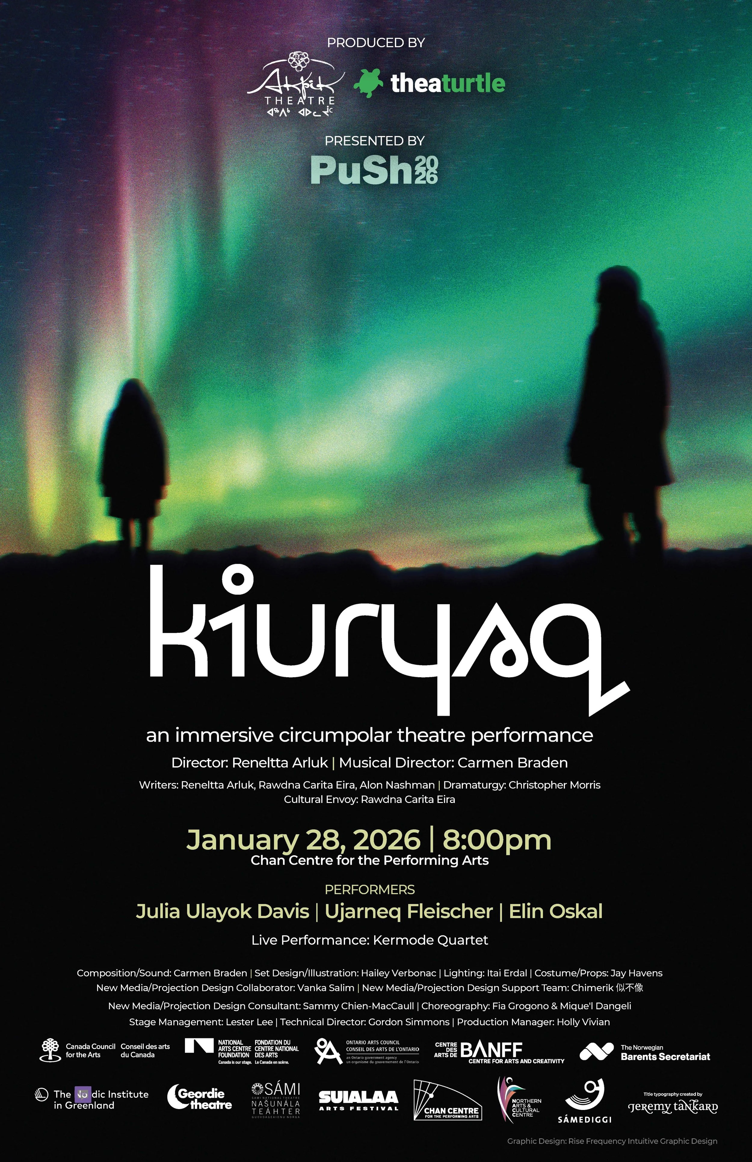 Kiuryaq is about about two siblings born in the north with one being separated by adoption down south. An older sister and a younger brother. One raised under the aurora with her grandparents and the younger brother raised with no knowledge of his place of birth, yet under the ancestral connection of the northern lights choices are made that change their realities. Kiuryaq is a transformative performance work which brings the circumpolar region together to share some wisdom, warnings, and humour to all those who are curious. In form, Kiuryaq is a blend of theatre, with three performers embodying multiple roles; concert, with original music played by a live string quartet; and film, with expansive, immersive projections. It is designed to tour for impact in multiple performance venues: Indigenous communities, large concert halls, theatres, from planetariums to snow amphitheatres and, of course, northern centres.